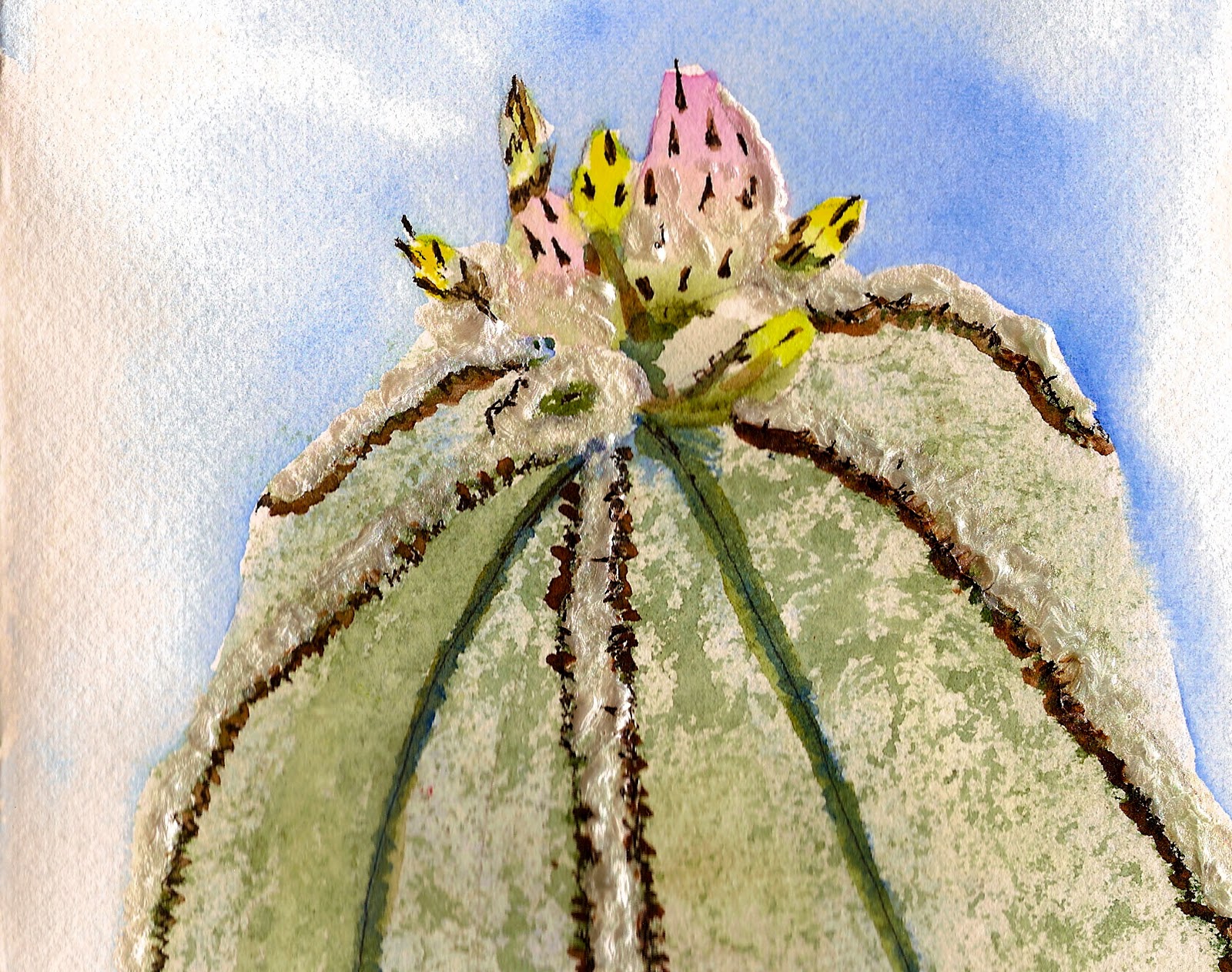 I tried a few different things on this painting. I covered the wet paint on the cactus itself with an old t-shirt and it gave a wonderful texture that is very close to the real cactus. Then I used acrylic for the line between the dark and on the top as it was a fuzzy kind of growth and of course, it looks better in the real painting.